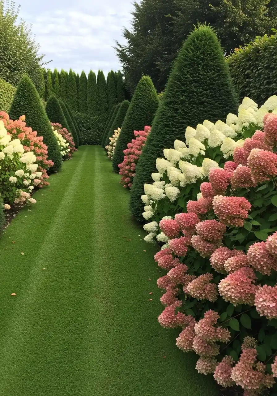 That hydrangea path with tall evergreen cones feels like walking down a green hallway with whipped-cream flowers. It’s dramatic but still peaceful, which is such a weird combo and I mean that in a good way. I’m kinda obsessed with how the lawn becomes the “floor” and the blooms become the “walls.” It makes the space feel longer and fancier.