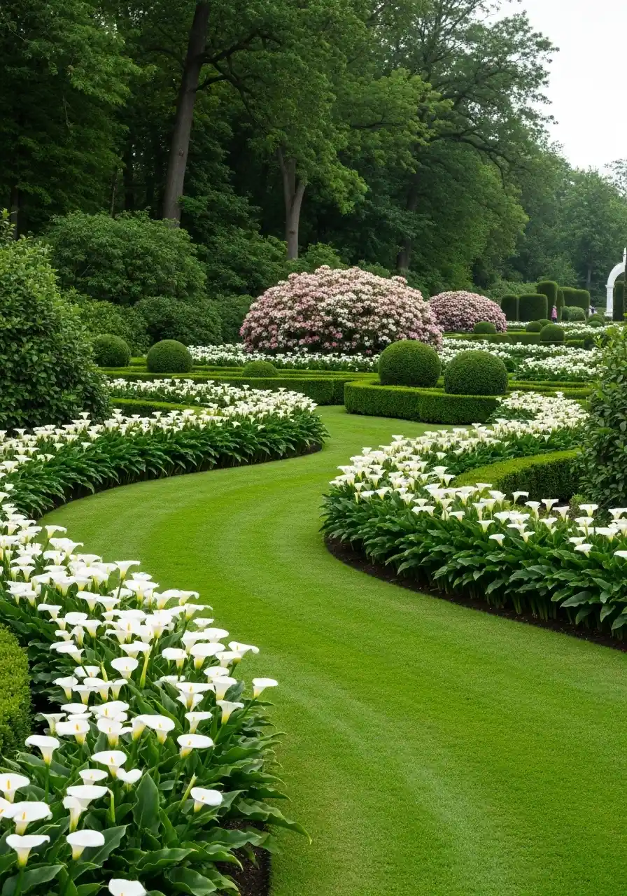 The border full of white calla lilies looks so smooth and crisp it almost feels fake. But that’s the point. It’s a clean line that makes the lawn look super green and intentional. I like this style when I want a “tidy brain” garden, you know? Like when life feels messy, the garden can be calm.