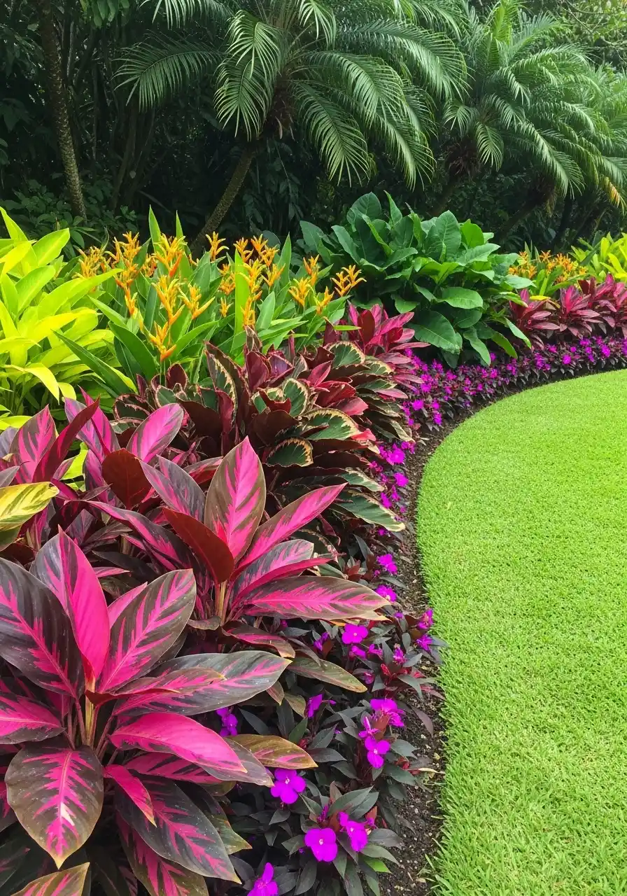 Tropical border plants with hot pink leaves and a bright lawn edge