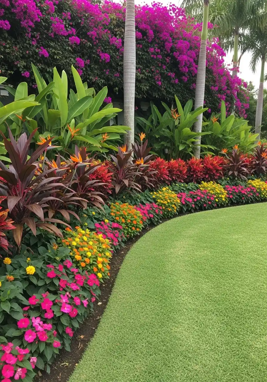 If you’re trying tropical garden border ideas plants, think in layers of leaf texture, not just flowers. Use big-leaf plants in the back (like elephant ear style shapes), mid-height colorful foliage in the middle (pink or red ti plants, coleus, or caladium vibes), and then a low edging plant at the front. Keep the edge line clean because tropical plants can get wild fast. Also, repeat your bold color at least three times so it looks planned, not random. This is a garden border ideas with plants trick I mess up sometimes, so I’m saying it to remind myself too.