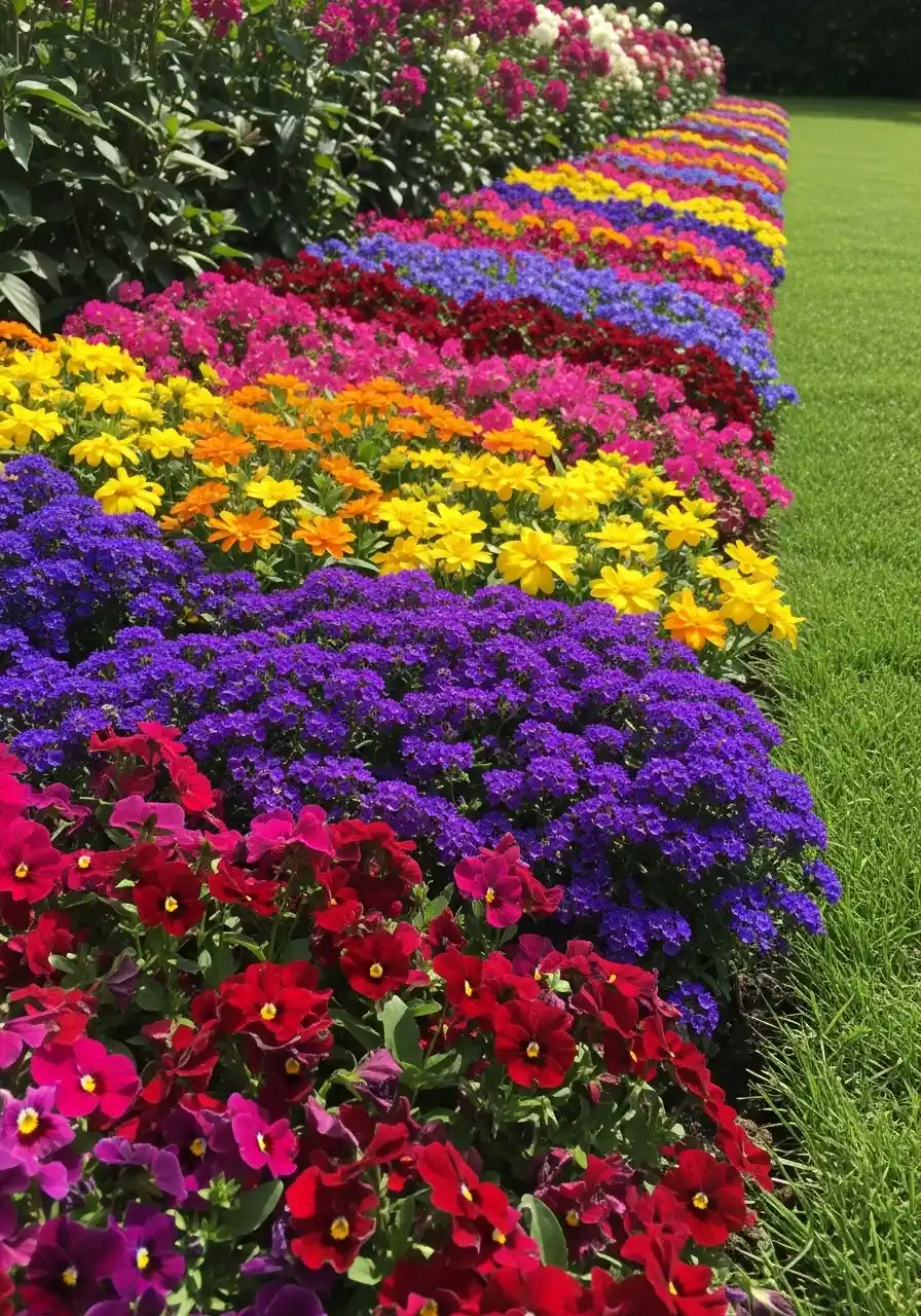If you want this style, pick plants that stay the same height so the stripes don’t get bumpy. Think petunias, calibrachoa, begonias, alyssum, or verbena. Plant tight, like tighter than you feel comfortable, because you want fast coverage. Also, do edging like your life depends on it. A clean trench edge or a low border strip keeps the rainbow from looking like a fuzzy blob. These garden border ideas plants are honestly part gardening, part graphic design.