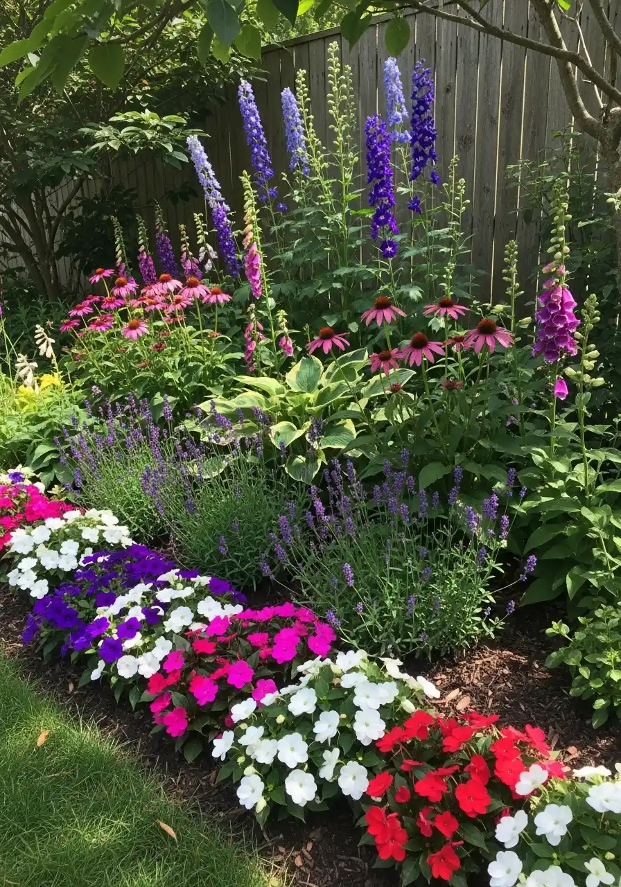 This one makes me feel calm and a little jealous, not gonna lie. You’ve got tall blue spikes (delphinium), tall pink foxglove, and purple coneflowers sitting like happy little suns. Then there’s lavender-ish mounds and a bright annual edging in front (white, pink, red impatiens vibe). It’s layered without feeling stiff, like it’s allowed to breathe.