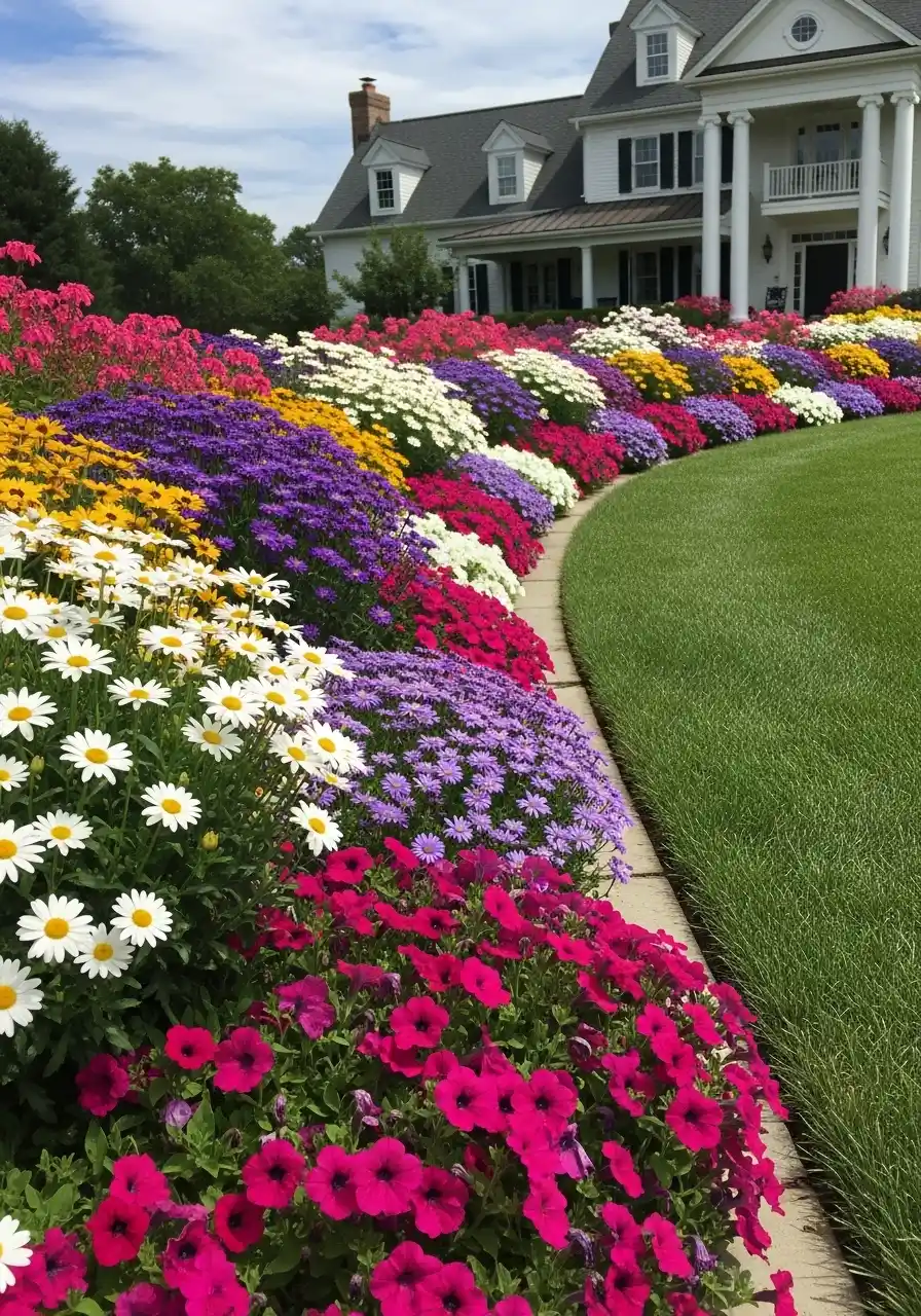 To copy it, plant your tallest color mounds farther from the grass line, then “lace” the edge with something lower. Daisies are great, but you could also use bacopa, alyssum, or low petunias. Repeat colors every few feet so it doesn’t look like one big mixed salad. And yes, I said salad, because I’ve made salad borders before, and it’s not cute. These garden border ideas with plants work because repetition keeps it calm.