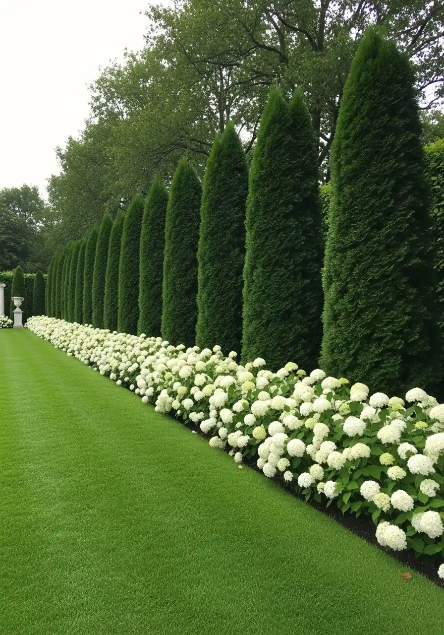 This is the cleanest border here, and it’s honestly stunning in a quiet way. Tall evergreen columns (arborvitae) make a solid wall, and then a line of white hydrangeas runs along the base like a frothy skirt. The lawn is smooth and simple, so the border stands out even more. It feels fancy but not loud.