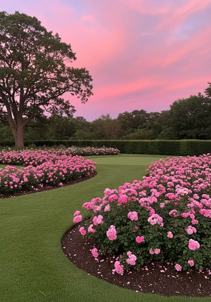 This one is simple, and it hits hard. Just big rounded beds of pink roses floating in a wide lawn, with a sunset sky that makes it look like a movie. It’s not crowded, and that’s the whole point. Negative space is powerful. The lawn becomes the “frame,” and the roses are the main character.