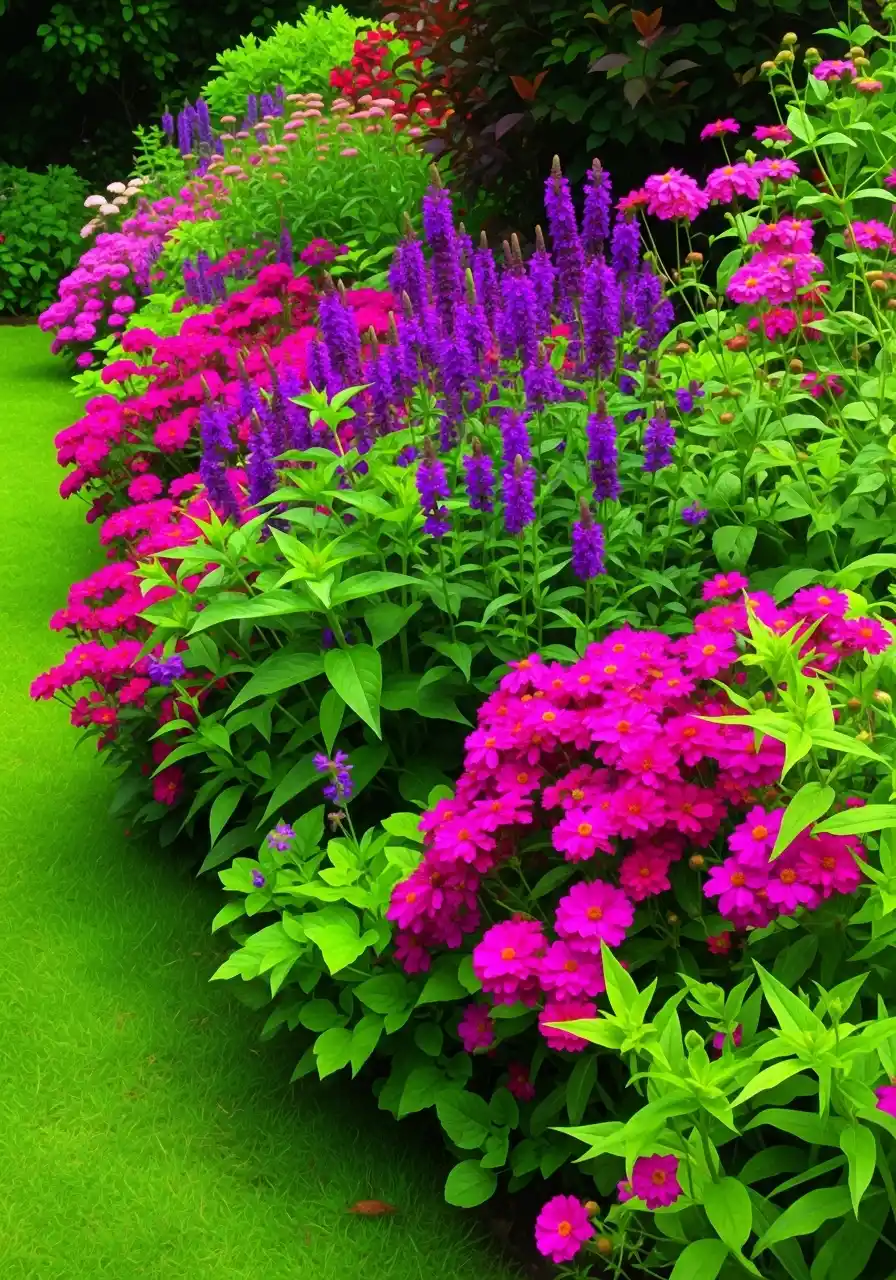 This border is LOUD, like neon-loud, and I mean that as a compliment. There’s a hot pink mass (zinnia-ish or phlox-ish), plus tall purple spikes (salvia), and then even more pink behind it. The greens are bright too, which makes the colors feel electric. It’s the kind of border that makes you feel awake, even if you’re tired.