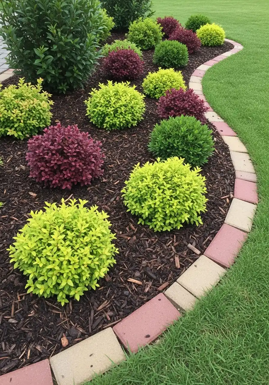 My trick: mix 2–3 shrub colors and repeat them, like a pattern. It makes the border feel designed, not random.