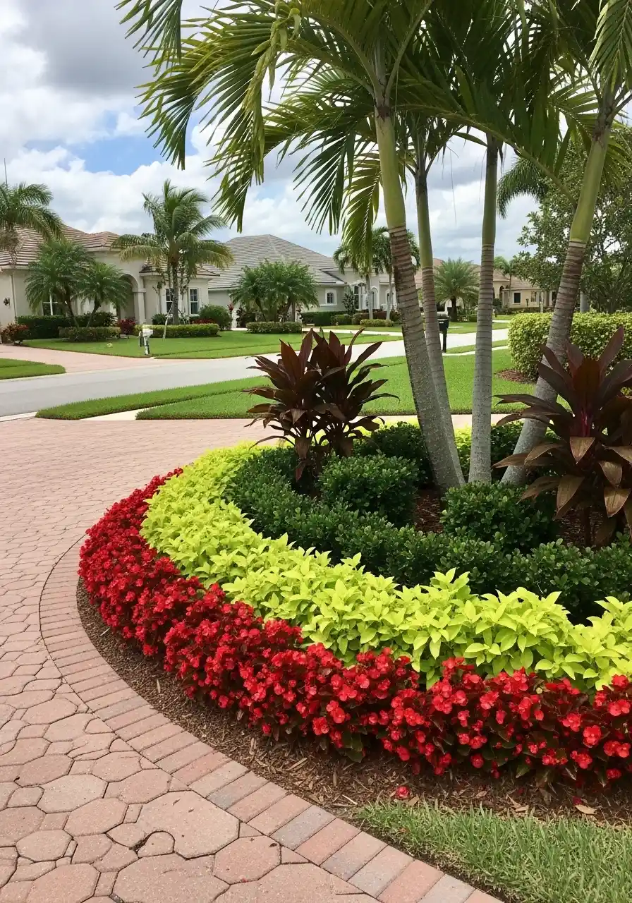 This border is basically a palm-tree “halo,” and I’m kinda obsessed with it. The curve hugs the driveway like a bracelet. The outer ring is bright red flowers (looks like begonias), then a lime-green band (could be something like duranta or a bright coleus type), then dark green shrubs tucked closer to the palm trunks. It’s layered like a cake, but the kind you don’t feel guilty staring at.