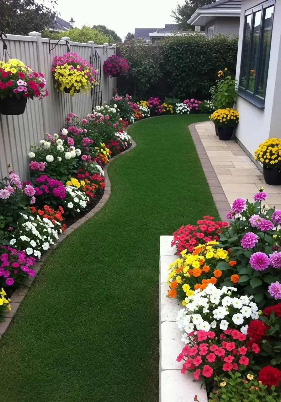 This is one of those border garden ideas that proves a skinny space can still be stunning. The grass path curves like a river, and both sides are stuffed with color. There’s hanging baskets on the fence, mixed blooms along the left, and then a big punch of flowers on the right corner near the patio. It’s like the garden is trying to hug you while you walk.