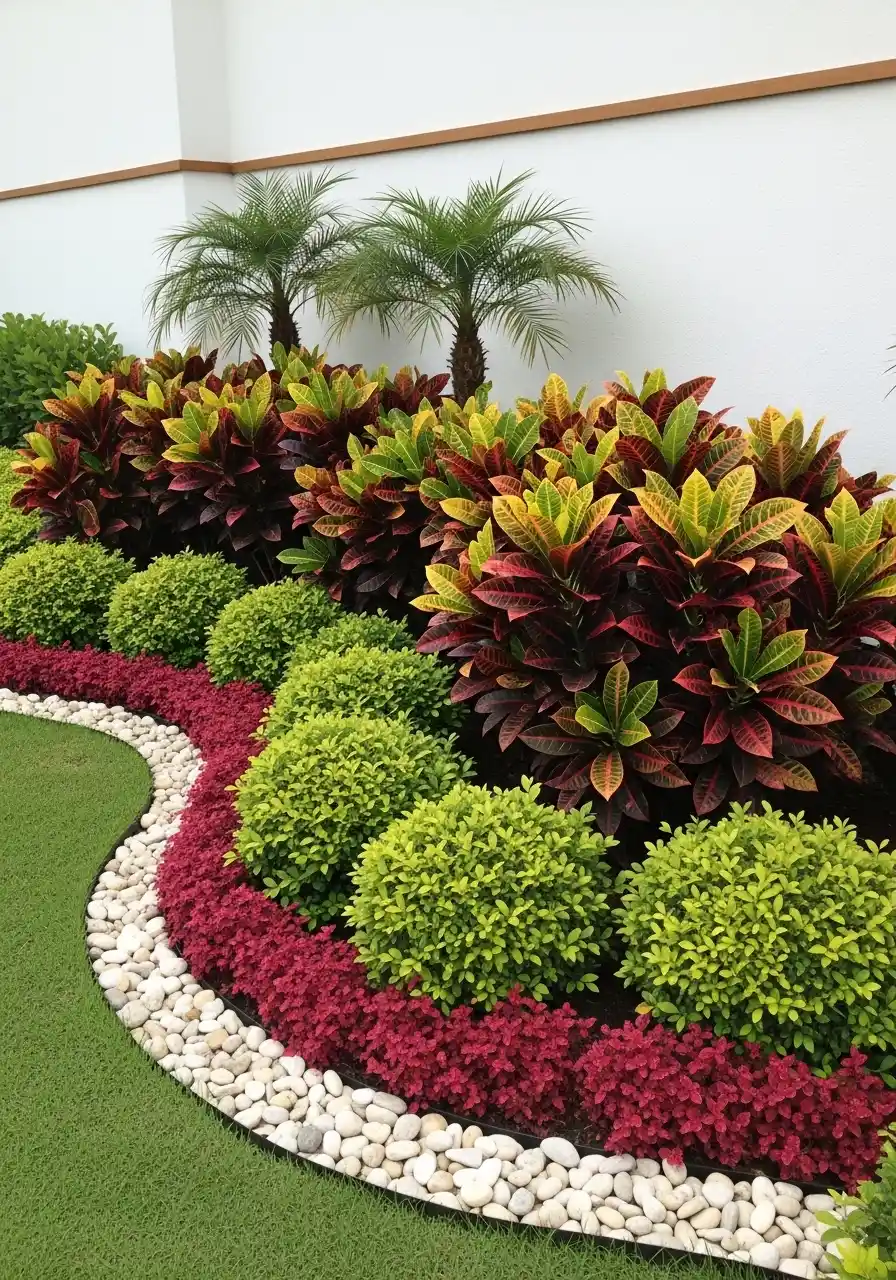 This one is super crisp, like it probably smells like fresh laundry somehow. It’s a layered shrub border with a bright white river rock strip along the grass edge. Then there’s a low red plant band, round lime-green shrubs, and tall dramatic croton-type plants with red and yellow leaves. It’s bold but still neat, which is not easy.