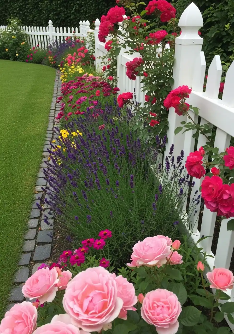 White picket fence border with roses and lavender
