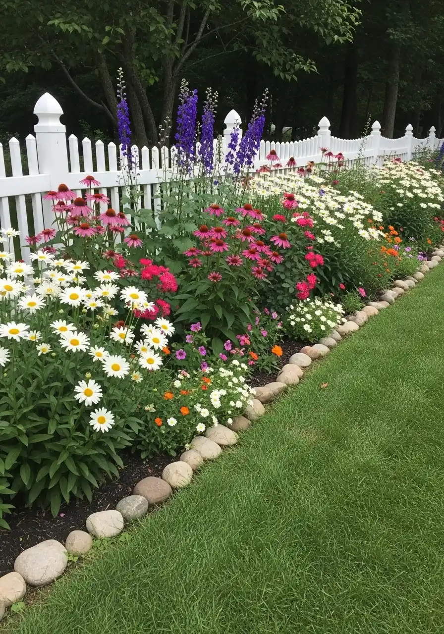 If you want this look, pick 3–5 main colors and repeat them down the line. Repeating is the secret sauce. Add taller spikes (like delphinium or salvia) toward the back, and keep low mounding flowers toward the front. Also, don’t skip mulch. Mulch is boring, but it makes the colors pop and saves you from watering every single day.