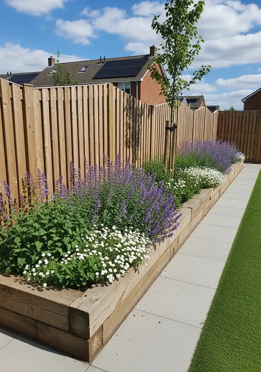 This raised bed is clean, simple, and honestly smart. The timber edge keeps soil in place, and it makes the planting line super straight. The planting itself is calming: lots of lavender-looking purple spikes and white flowers mixed in. Plus, there’s a young tree planted as a vertical feature, so the border isn’t just “flat line of plants.”