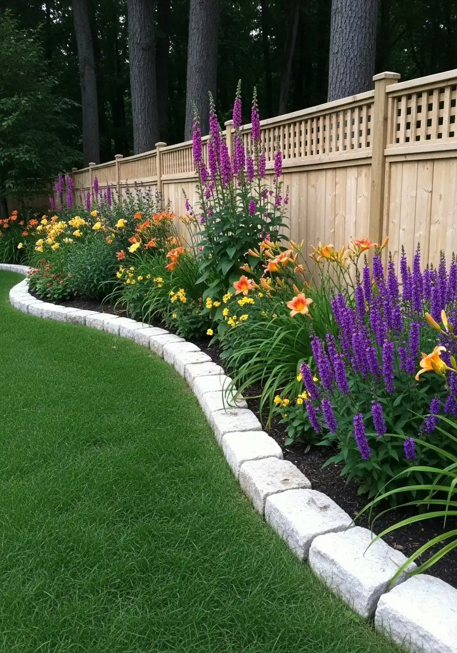 If you’re doing this, use good soil in the raised bed. Not random dirt you dug up. Raised beds dry out faster too, so add mulch and water deeply. The best trick is to plant in long “drifts,” like a big ribbon of purple, then a ribbon of white. It makes the fence line feel longer and more peaceful. These are the kind of garden border ideas that look expensive, but it’s mostly just good repetition.