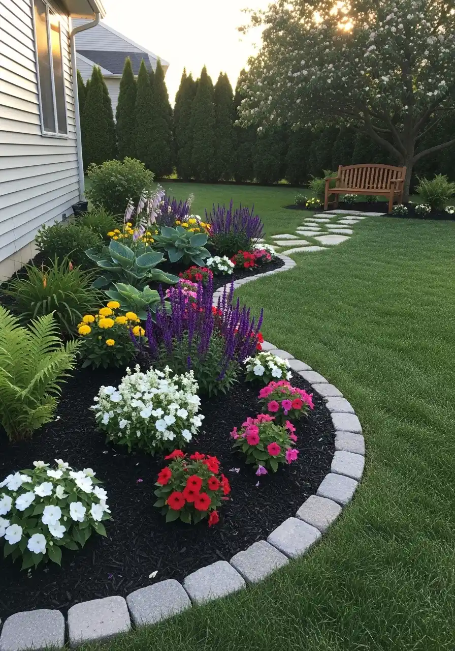 This setup feels like a garden that wants you to slow down. There’s a curved bed by the house, flowers and purple spikes, and then stepping stones leading toward a bench under a tree. It’s not just a border, it’s a path moment. I love that, because it makes the yard feel like a place, not just grass.