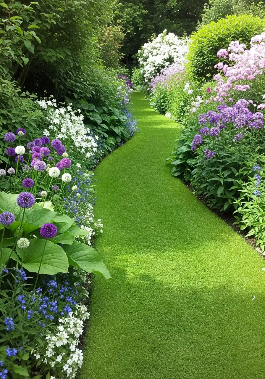This one feels like walking through a secret garden, and yeah it makes me jealous. The grass path curves through thick borders on both sides. I see purple allium globes, white flowers, and soft lavender tones deeper in. It’s layered, lush, and it feels cooler just looking at it.