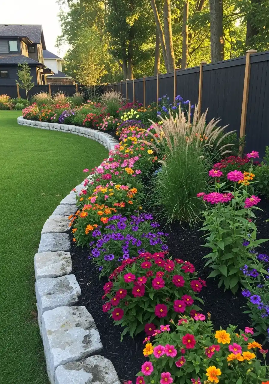 This last one is a full-on statement border. The black fence makes every color brighter, and the stone edging keeps the curve crisp. There are ornamental grasses for height and movement, plus loads of colorful blooms packed in like a ribbon. This is one of those front yard border ideas that makes the whole yard look professionally done.