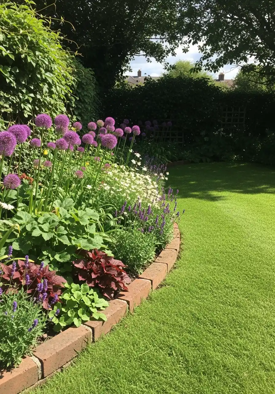 Cottage border with purple alliums and brick edging