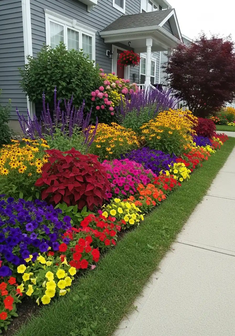 This one is loud in the best way. It’s like the border is yelling “HI” as you walk up. There are tall purple spikes (salvia), yellow blooms (rudbeckia), bright reds, and dense color in layers. These kinds of flower bed border ideas work great by sidewalks because people see them up close.