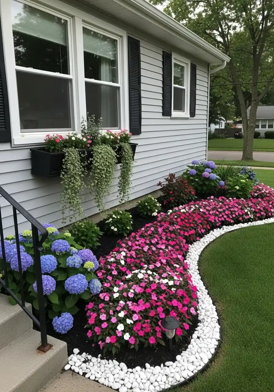 I love this one because it mixes the house with the garden in a way that feels friendly. The white stone “river” edge is super clean, and the pink flowers inside the bed look like a soft carpet. Add hydrangeas for that big, bold bloom moment near the steps, and you’re set.