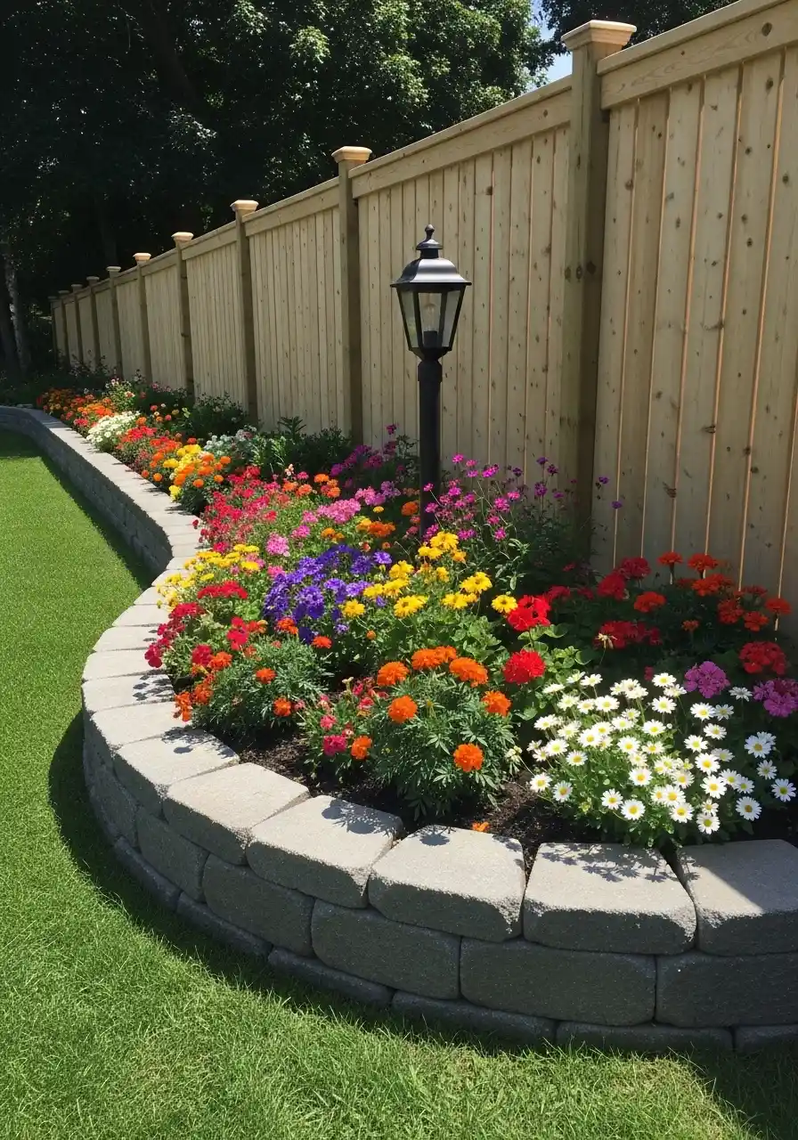 This is one of those garden edging ideas that makes a plain fence look expensive. The fence becomes a backdrop, and the flowers do the showing off. I see bright oranges, yellows, purples, and blues layered like stripes. That’s not an accident. It’s color blocking, and it works because the plants are massed in chunks.