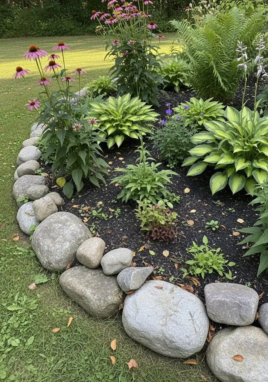 Planting-wise, I like soft plants near hard rocks. Think low groundcovers or mounding flowers that spill over the stone edging. And if you’re worried about mowing, keep the boulders just far enough from the grass edge so your mower wheels don’t keep banging them. That sound drives me nuts.