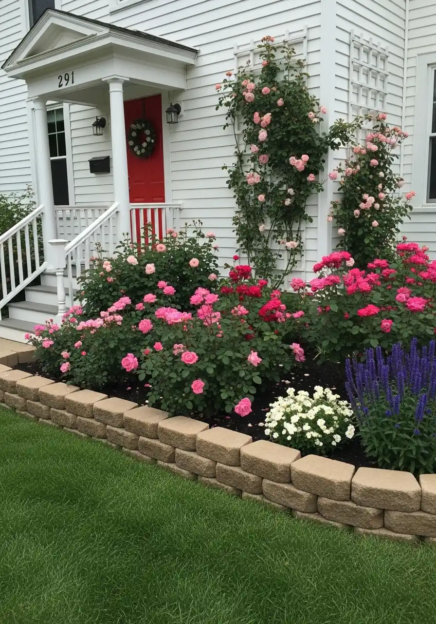 This first idea is the “welcome home” setup. In the photo, the front bed is held in place with stacked tan blocks, and it makes the roses look even more fancy. I like how the border is not trying too hard, but it still feels polished. It’s the kind of garden stone border that makes guests think you’re organized, even if your junk drawer says otherwise.