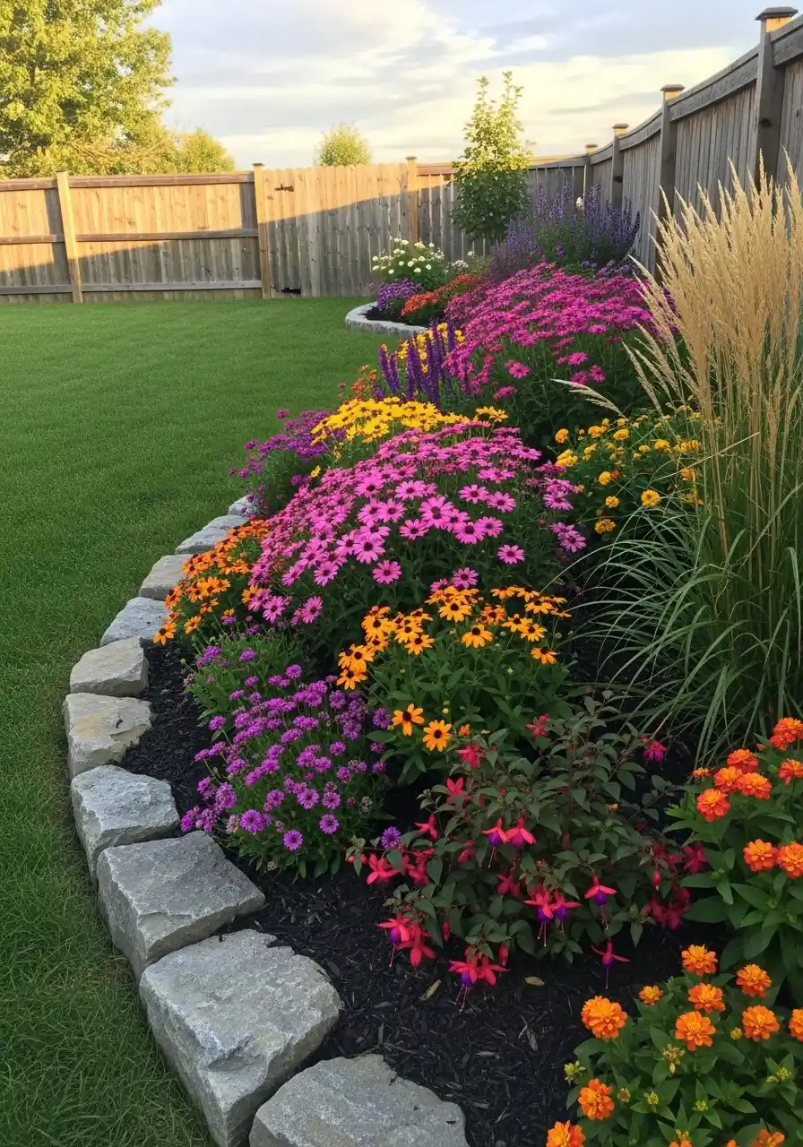 Curved rock edging along a fence packed with bold color