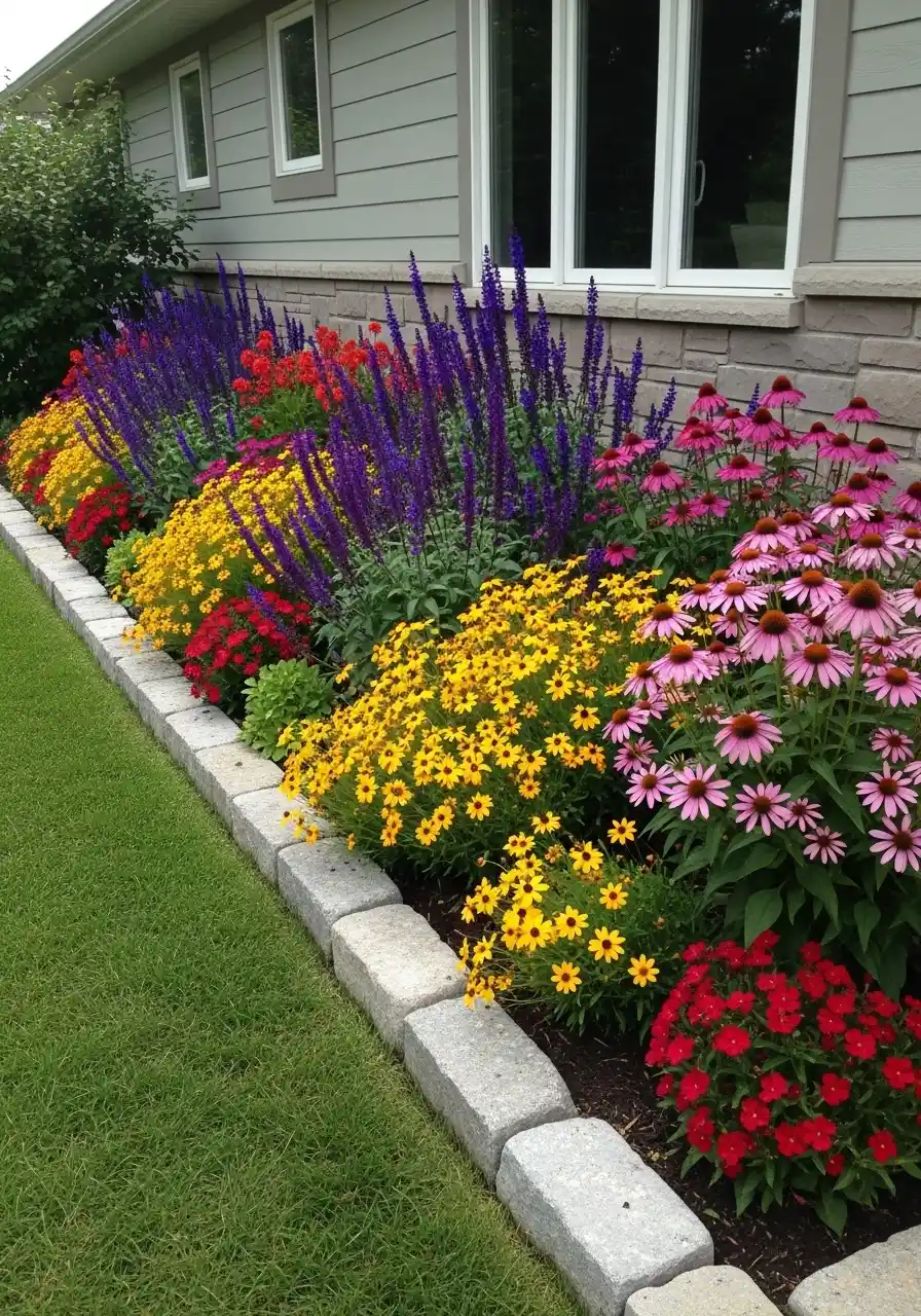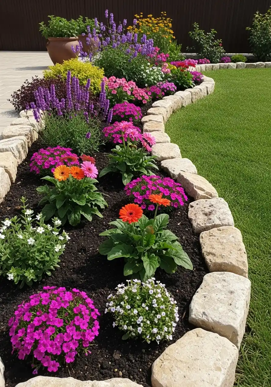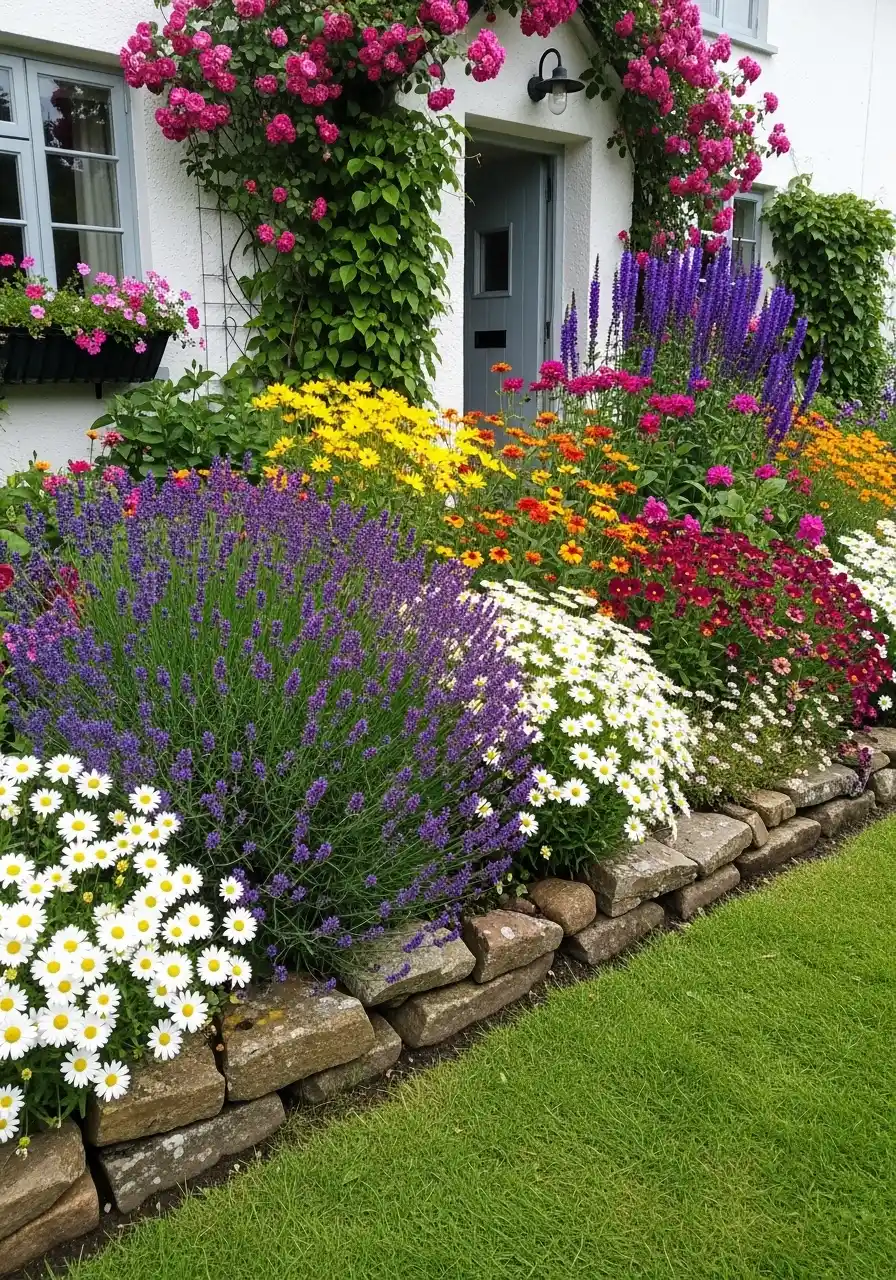 This is the cozy one. A stacked stone border, slightly uneven, with lush flowers packed behind it. It feels like a home that’s loved, not just decorated. The stones aren’t perfect rectangles, and that’s the charm.