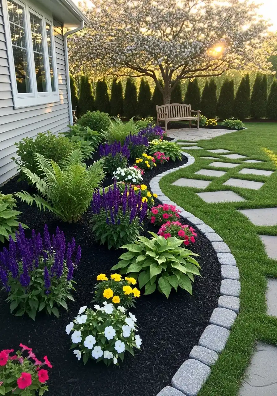 For plants, this style looks best with big color drifts. Like one chunk of pinks, one chunk of yellows, one chunk of purples. When flowers are scattered randomly, the clean stone edging feels too strict. Also, put mulch slightly lower than the top of the stone. If mulch sits higher, it spills onto the lawn and ruins the tidy line.