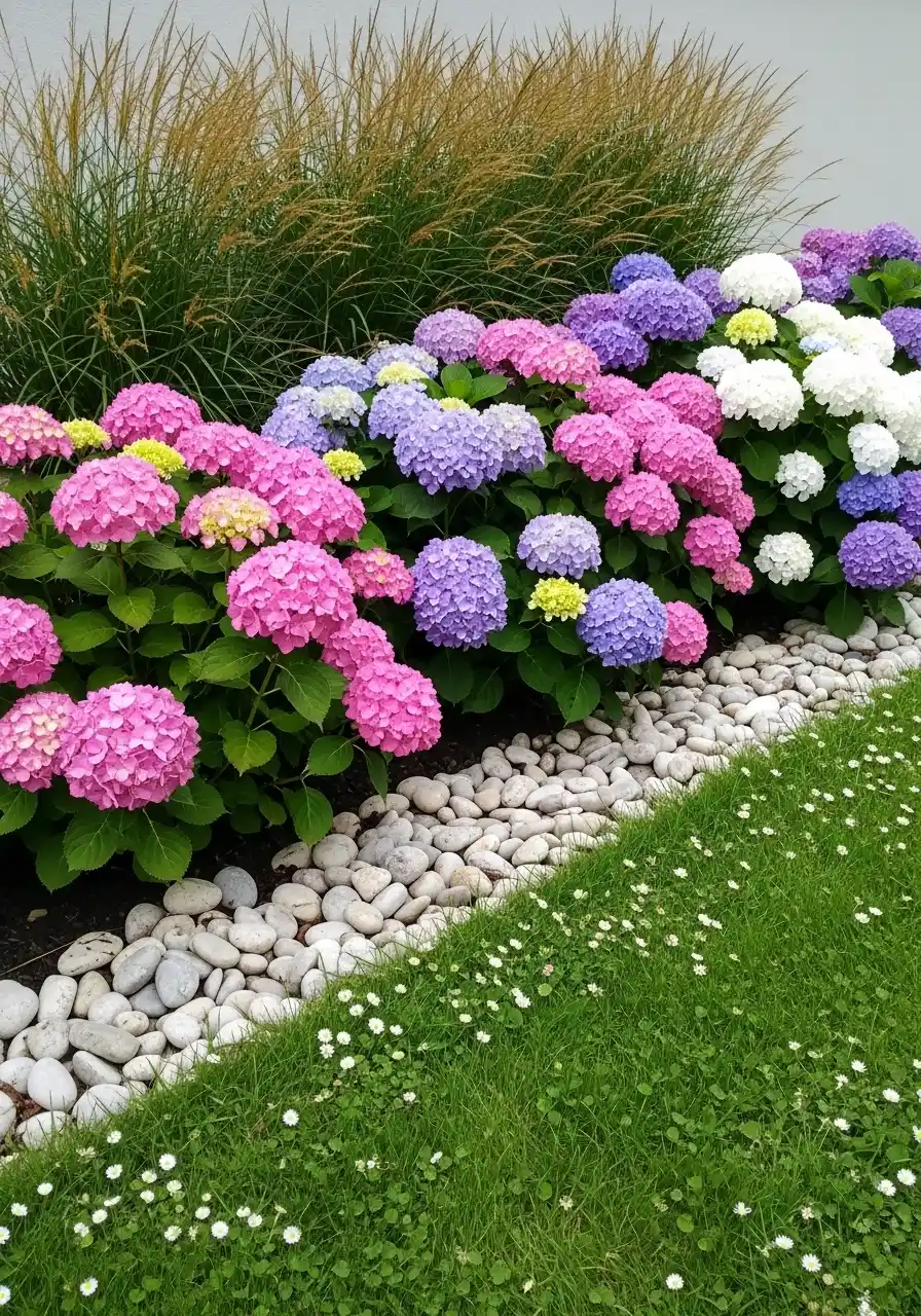 Hydrangeas already look like fluffy clouds, and the smooth river rocks make them look even softer. In the image, the river rock border sits between the bed and the grass, creating a clean strip that also helps with drainage. I love this because it feels gentle and fancy without being fussy.