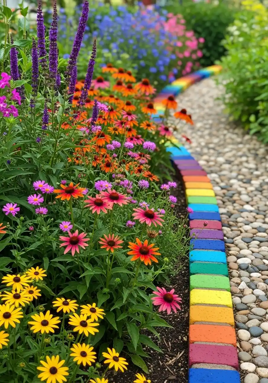 This last idea is such a mood. A rainbow-painted brick border curves along a gravel path, with bold flowers right beside it. It’s part garden stone border, part art project. And it works because the gravel is neutral, so the bright edge doesn’t feel like too much.