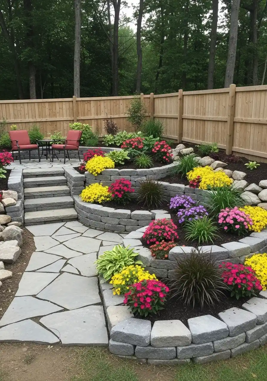 This one is like a backyard “hangout garden.” Curved retaining wall blocks create raised rings, and they act as both border and structure. It’s technically block edging, but it still counts as a rock/stone border vibe because it’s masonry and weighty.