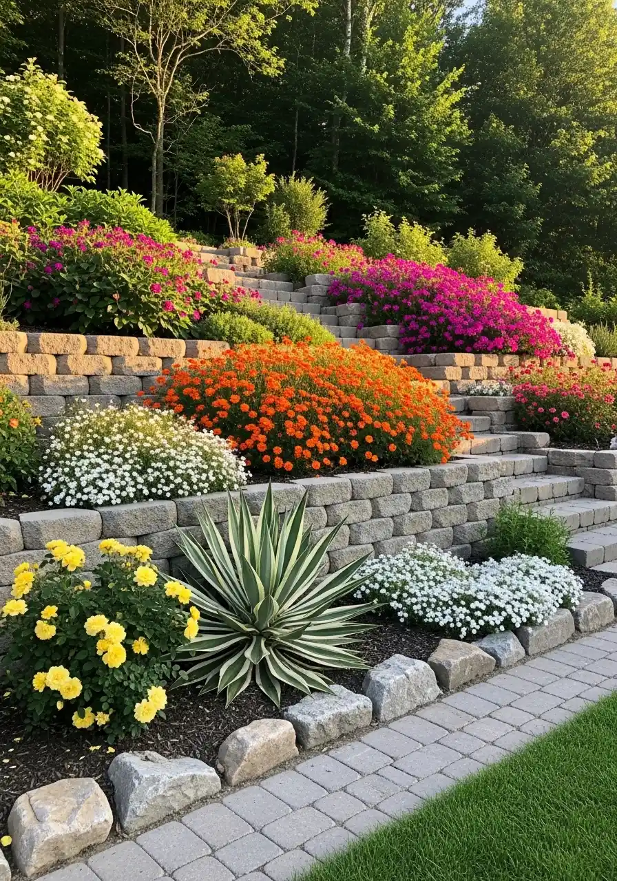 To build this, use uniform stones and keep them level. A tight string line helps, even if it feels extra. Then plant in layers: tall in the back, medium in the middle, low in the front. The best part is maintenance gets easier because the border gives you a clear mowing edge. If you’re choosing plants, pick a few that bloom at different times so it doesn’t go dull mid-summer.