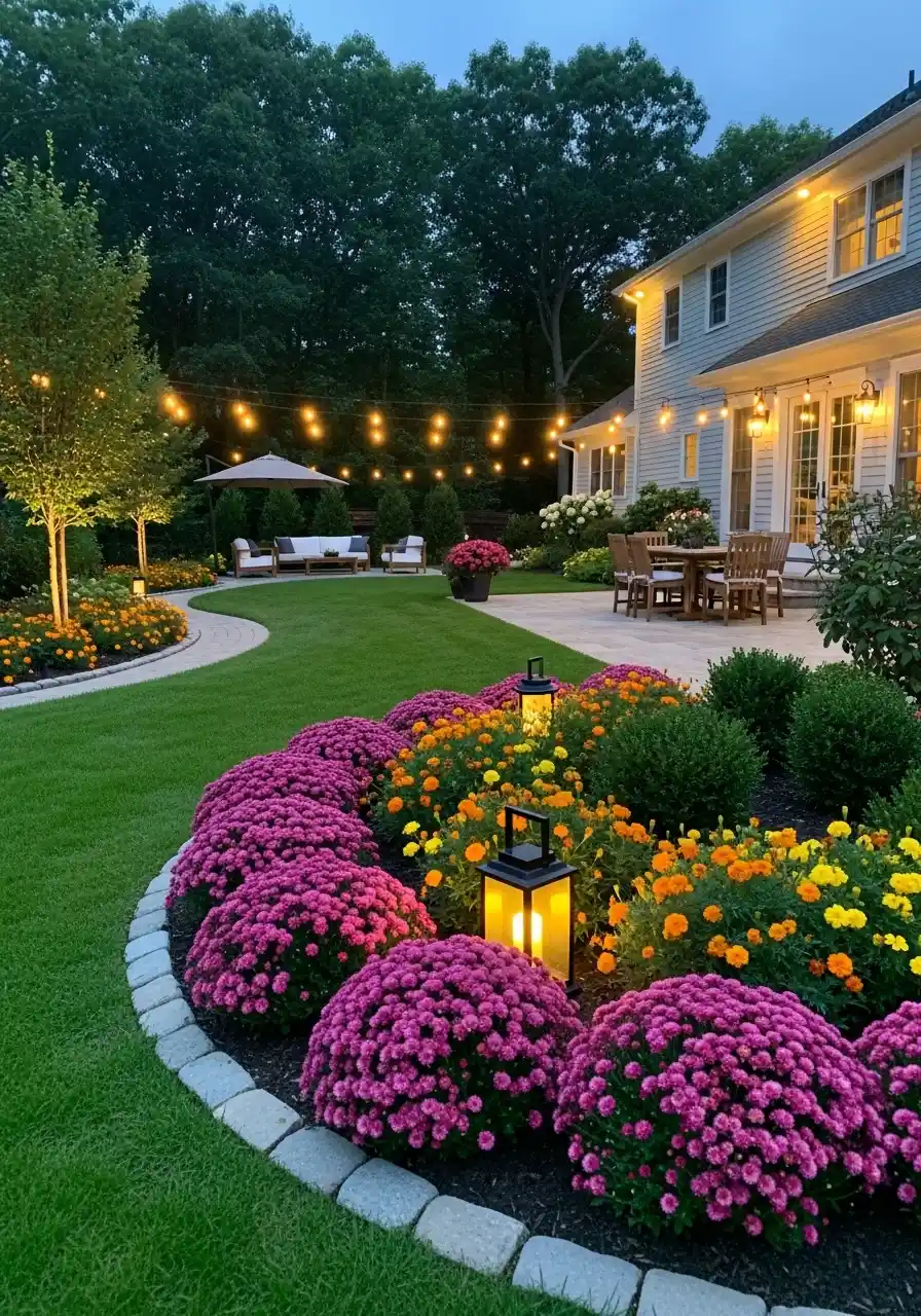Planting tip: choose some flowers that hold shape at dusk, like mounding blooms and shrubs. Tall thin flowers disappear at night. And use dark mulch so the lights make the plants “float.” This is one of those garden rock border setups that feels expensive, even if it wasn’t.