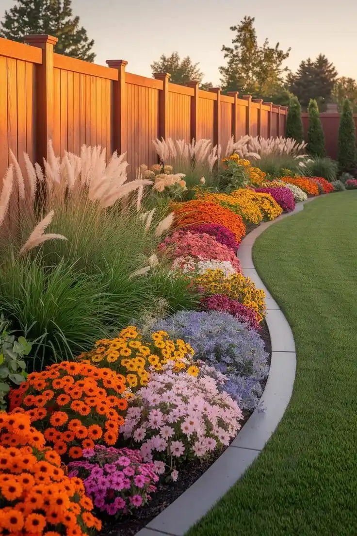 Fence-line border with grasses, mums, and a smooth edging strip