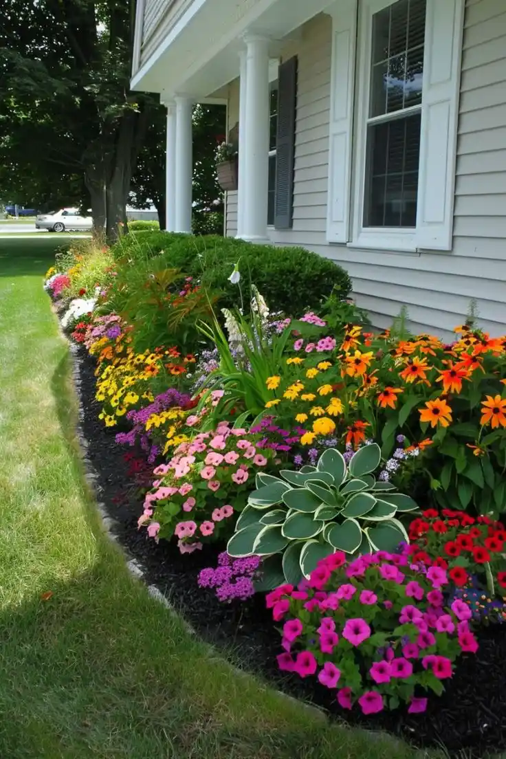 Tip: if you want this style but not the maintenance, use more shrubs and fewer annuals. Shrubs give you structure all year, and then you can add seasonal color in a few spots. That’s a smarter shrub border landscaping plan if you don’t want to replant constantly.