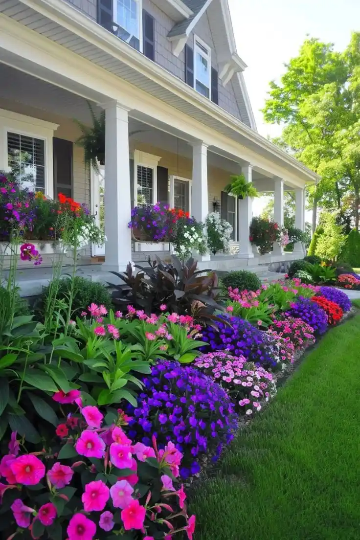 This porch border has that layered, welcoming vibe. The shrubs sit back near the house, and the front edge is packed with purples, pinks, and little pops of bright color. It feels cozy, like the house is dressed up for guests even if nobody is coming over.