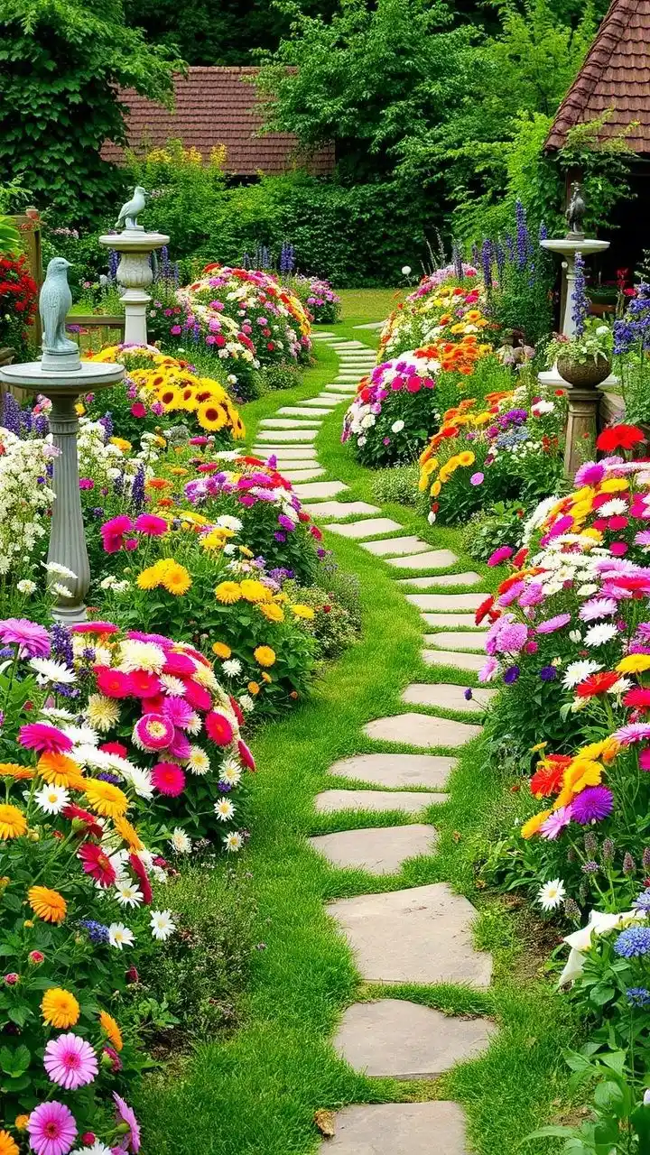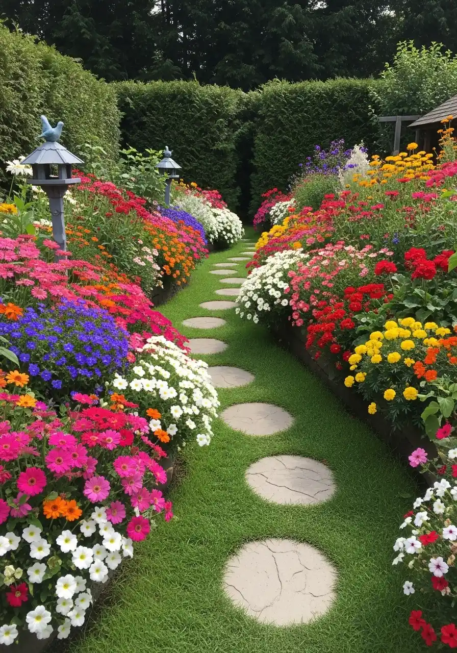 The stepping stone path through tall, overflowing flowers feels like a hidden hallway. It’s playful and kind of dreamy. A garden shrubs border here isn’t just a frame, it’s the walls of the path, like you’re walking through color.