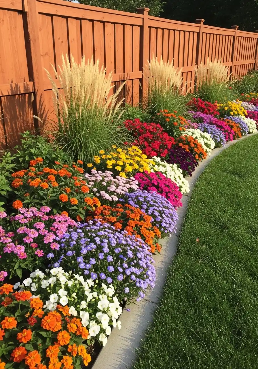 This next one is a long, curving fence border that feels cozy at sunset. The grasses soften the fence, and the flowers are planted in bright piles along the curve. The concrete edging keeps everything from spilling into the lawn, and that’s what makes it feel clean.