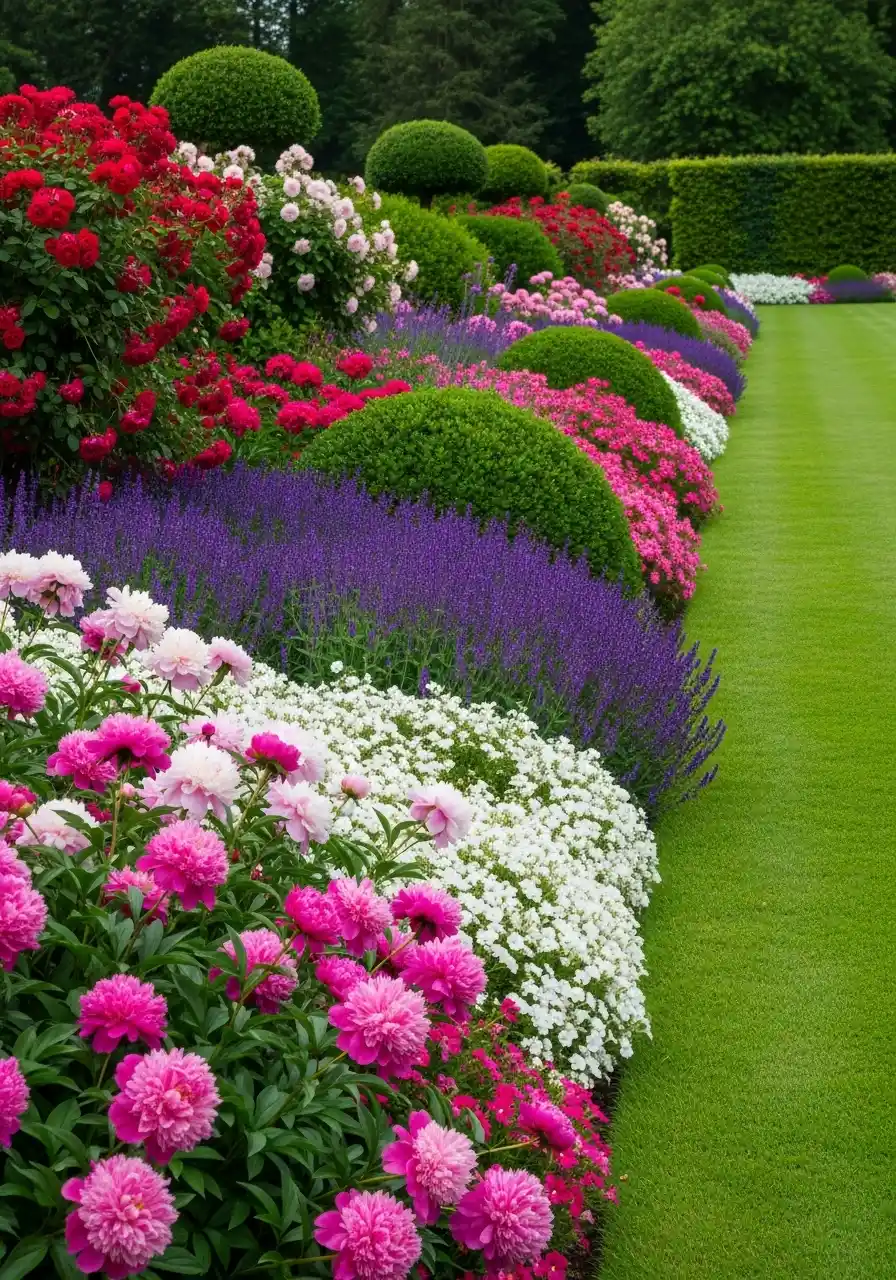 This one is fancy. Rounded green shrubs like little pillows, bands of purple flowers, and roses rising behind. It feels like a planned estate garden, not a casual backyard. A garden shrubs border like this looks calm because of structure. The clipped shrubs act like punctuation marks.