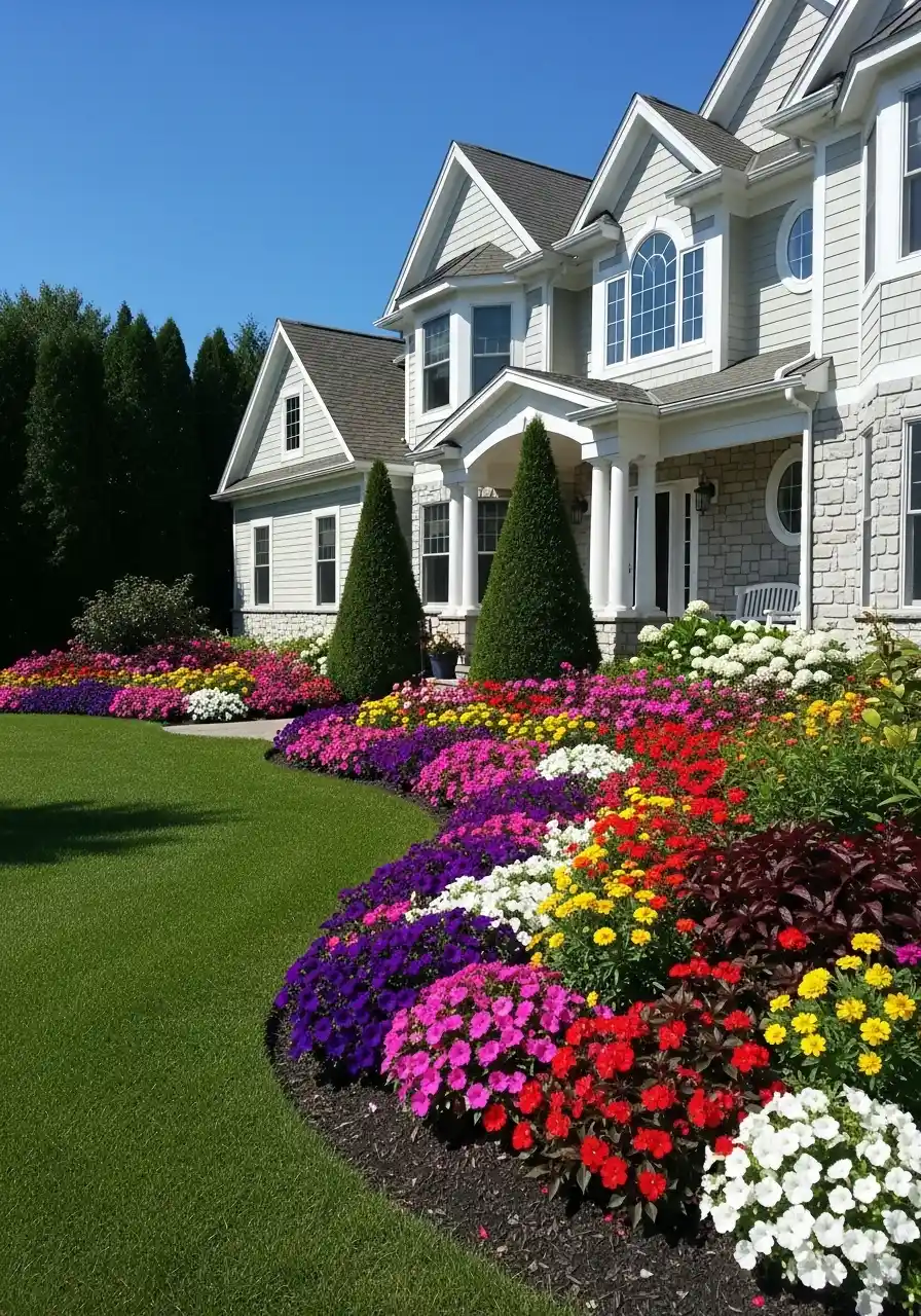 This next one feels like a “wow” yard. Big sweeping borders, thick groups of flowers, and tall evergreens framing the house. A garden shrubs border here is basically a giant ribbon around the lawn. It makes the grass look greener too, because bright flowers next to green lawn is just a good combo.