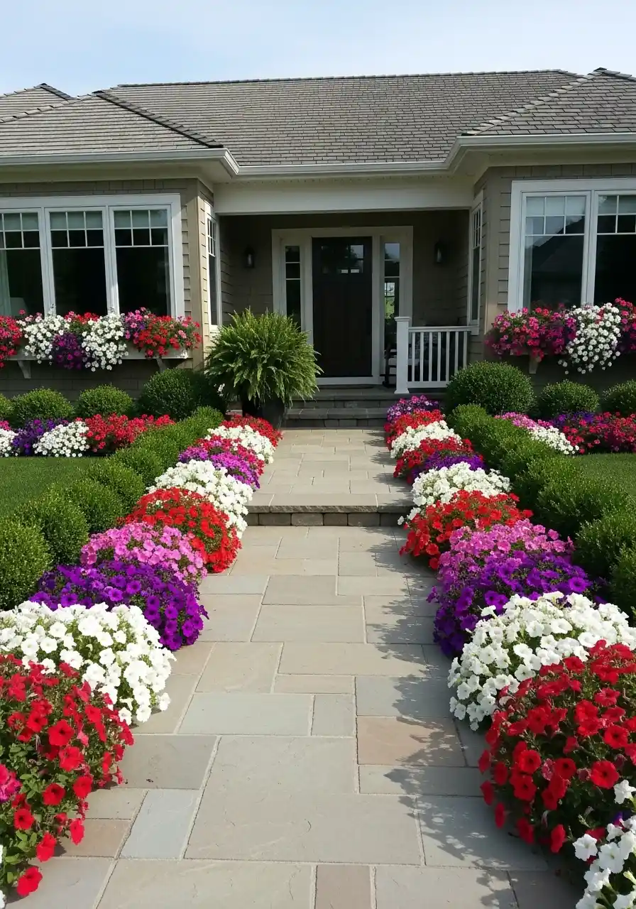 A front walkway lined like a flower parade