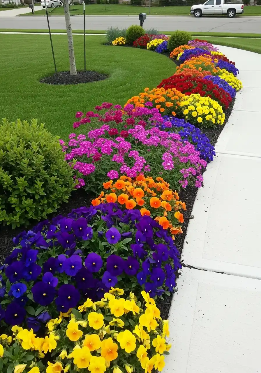 Curved curbside border with layered shrubs + rainbow blooms