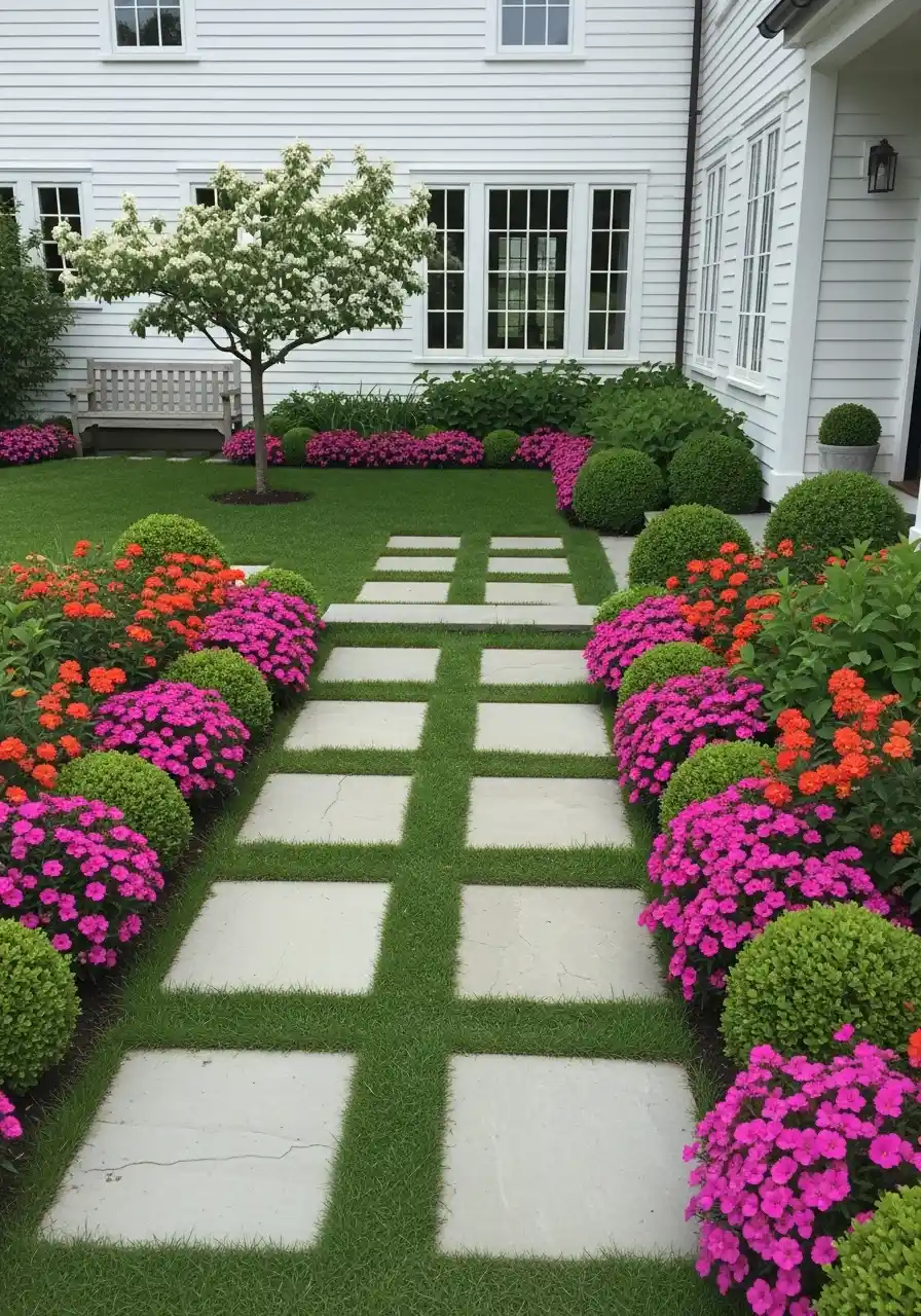 This garden looks like somebody measured everything twice, and honestly I respect it. The stepping stones make a clean grid, and the shrubs are clipped into neat green balls. Then the hot pink and orange flowers soften all that strictness so it doesn’t feel cold.