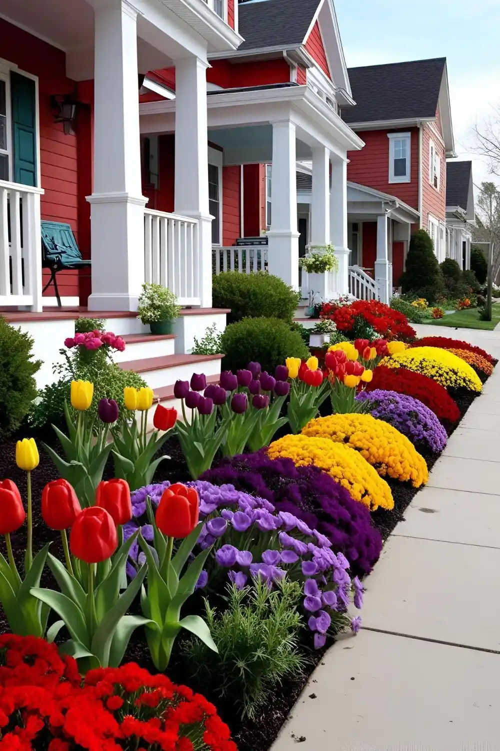 Porch-side drama with tulips, mums, and evergreen shrub lumps