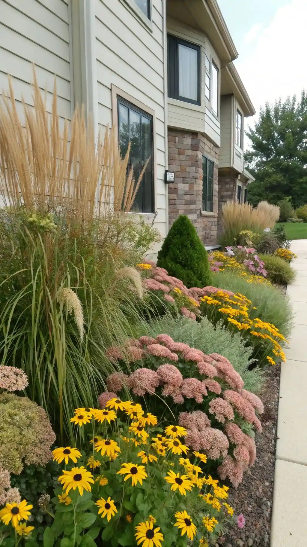 This border is calmer, like it’s whispering instead of shouting. Tall ornamental grasses add movement, and the yellow flowers bring warmth without being too bright. Shrubs and rounded shapes give it a grounded feel, so the grasses don’t look wild and lonely.