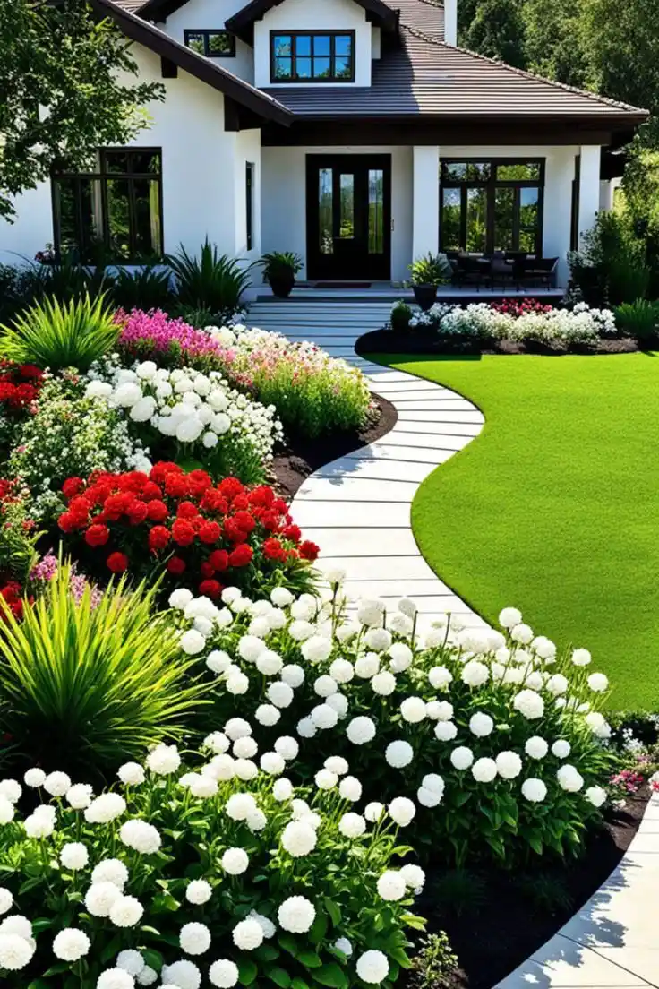 This is bold and kind of playful. The red house makes the colors pop harder, and the border uses big mounds of yellow, purple, and red flowers. Between them, rounded shrubs keep it from being pure chaos. It’s like candy, but organized candy.