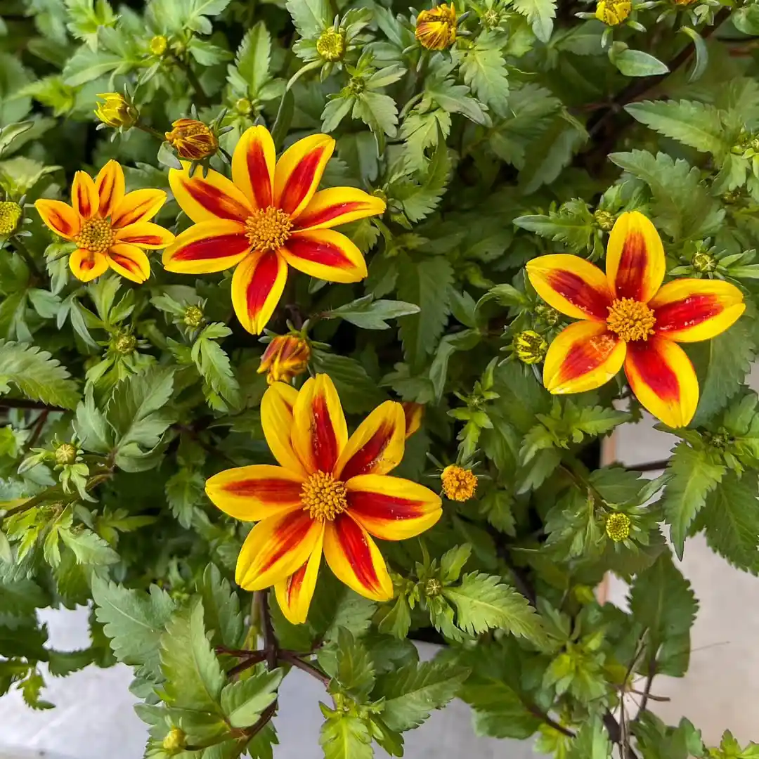When I want pure sunshine color, I grab bidens. The daisy-like blooms are small but so abundant they read as a solid golden waterfall. Are they tubular? Not really, but the sheer number of nectar points draws regular fly-bys, especially when paired with red tubes nearby.
