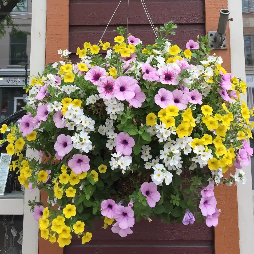 Petunia + calibrachoa + verbena in one sunny basket. They forgive imperfect watering and bloom like crazy. Fuchsia + torenia + impatiens for bright shade.